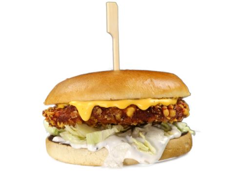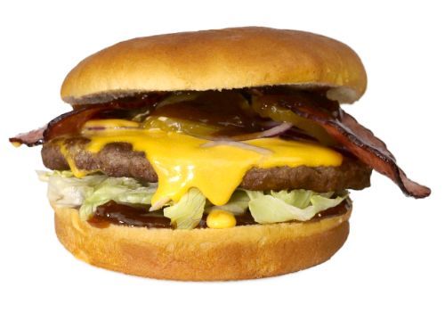Rinderpatty mit Onion Relish, Putenbacon, doppelt Käse, Salat, Gurken, Tomate und rote Zwiebeln
